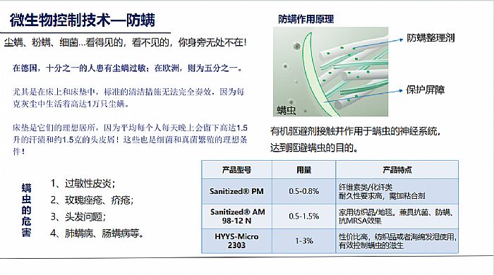 防螨整理是健康家居领域的一个重要分支,其主要目的是通过纺织品后整理技术,赋予织物抑制或驱避螨虫的能力,从而减少因螨虫及其排泄物引起的过敏问题(如过敏性鼻炎、哮喘、湿疹等)。