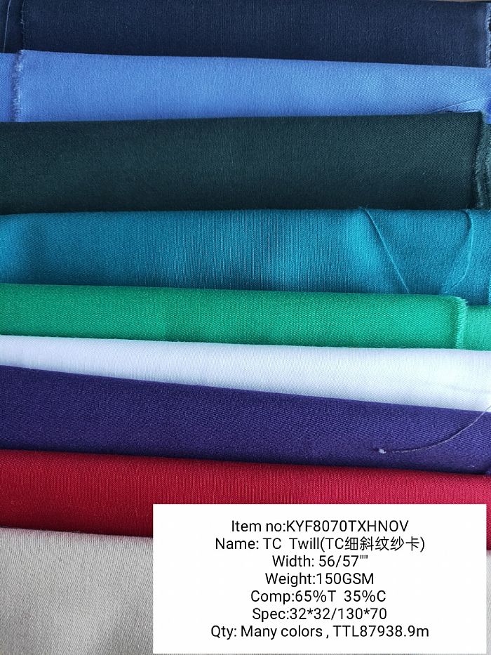 width: 56/57"", package: roll s, moq: all clear, composition: 65%T 35%C, density: 32*32/130*70, weight: 150GSM, color: have many colors