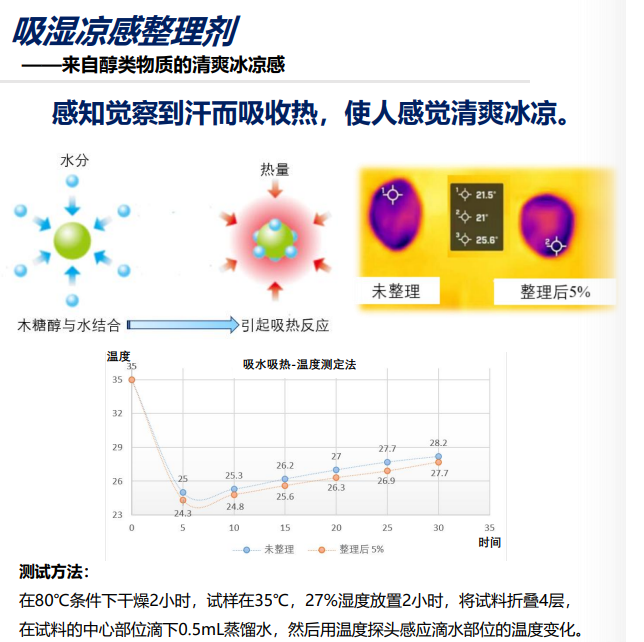 吸湿凉感整理剂通过物理导热加速水分蒸发 的机理,为纺织品提供了切实可行的降温解决方案。 它是夏季功能性纺织品市场的绝对主力,技术相对成熟,市场广阔。