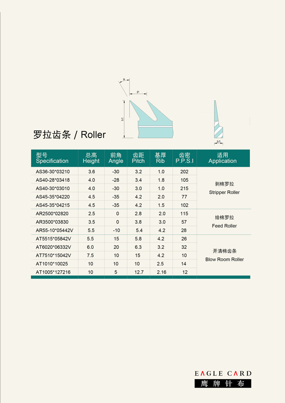 Eagle textile has been engaged in card clothing for 40 years. Our concentrate in manufacturing and stable quality, together with continuous innovative technology development and strategic cooperation with Bekaert, create high quality card clothing and value to our customers. Eagle textile offers a complete range of clothing for short staple applications which contains blow room, feed roller, cylinder, doffer and lickerin wires as well as flexible tops, stationary flats and cleaning fillets. Eagle textile offers its help to specify card clothing depending on card and on application in order for the customer to achieve the best performance in terms of carding and spinning quality as well as lifetime of the card clothing. As the second brand after Geron and White Shark in China market, Eagle textile more focus on product quality, stability and variety, and applies to more cost-effective products, more timely delivery and more omni-directional service. Advocating: moral character, pragmatism, innovation and progress. Guidelines: Simple, Fast, Correct. Pursuit: Reputation, Quality, Specification, Efficiency. Culture: Learning must be based on experience, and business must be specialized.